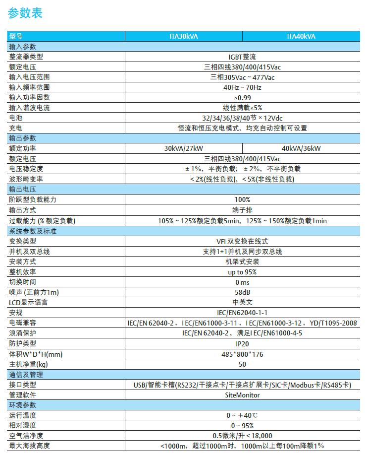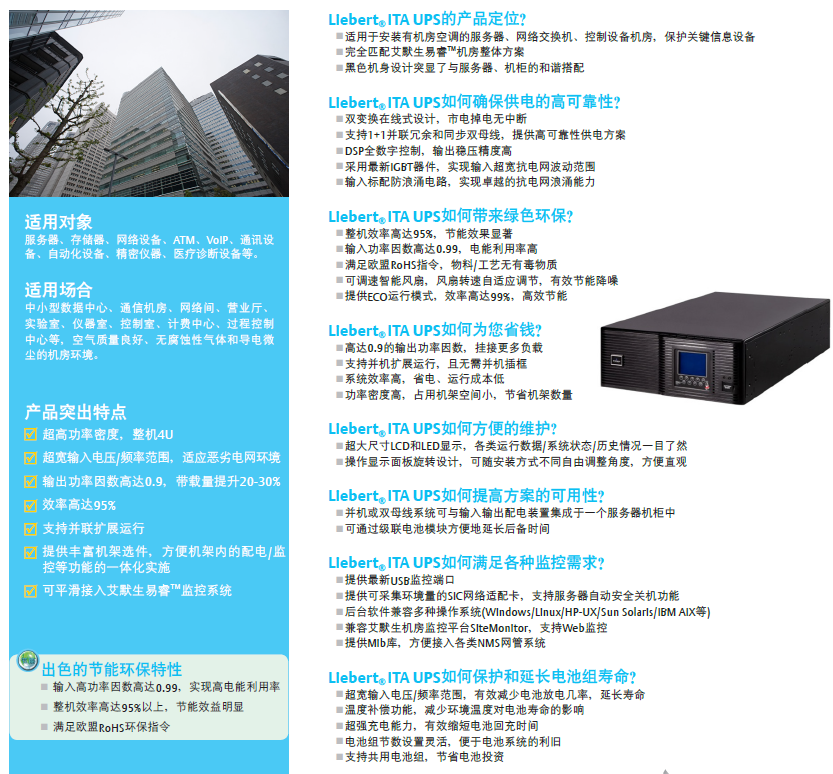 ITA 30-40KVA UPS 為三進三出型(三相輸入,三相輸出)全數字在線式智能交流不間斷電源系統,共有二個規格,單機額定輸出功率為30KVA,40KVA,可4臺機器直接并聯運行。適用于安裝有機房空調的服務器、網絡交換機、控制設備機房,保護關鍵信息設備,完全匹配艾默生易睿TM機房整體方案 ;