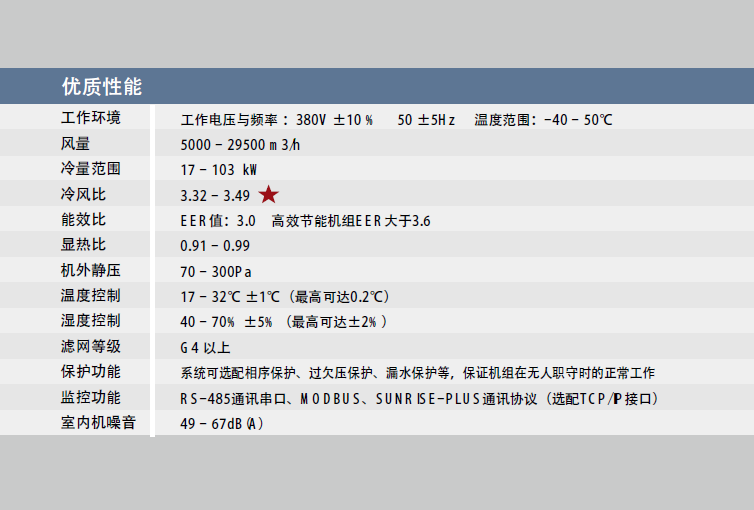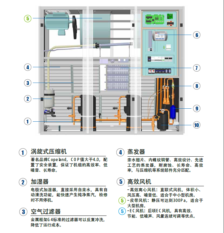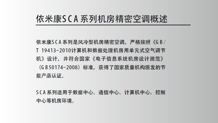依米康SCA.NE系列是智能新風+機械制冷一體機節能機房空調,嚴格按照《計算機和數據處理機房單元式空氣調節機》(GB/T19413-2010)設計,并符合國家《電子信息系統機房設計規范》(GB 50174-2008)標準。 SCA.NE系列機組采用新風自然冷源供冷+機械制冷方式,在室外溫濕度條件合適時,采用新風自然冷卻方式,一次回風+新風系統設計,在環境溫度較低時,采用引進室外新風,室內多余熱空氣采用氣壓差排到室外方式制冷,機組能效比可達17以上。在室外環境溫濕度不適合新風自然冷卻方式時,采用機械制冷(風冷)方式對機房內溫濕度環境進行調調控,能效比>3.0; SCA.NE系列機組適用于數據中心、通訊中心、計算機中心、控制中心等機房環境,也可用于老舊機房的節能改造。