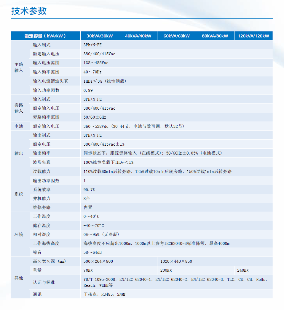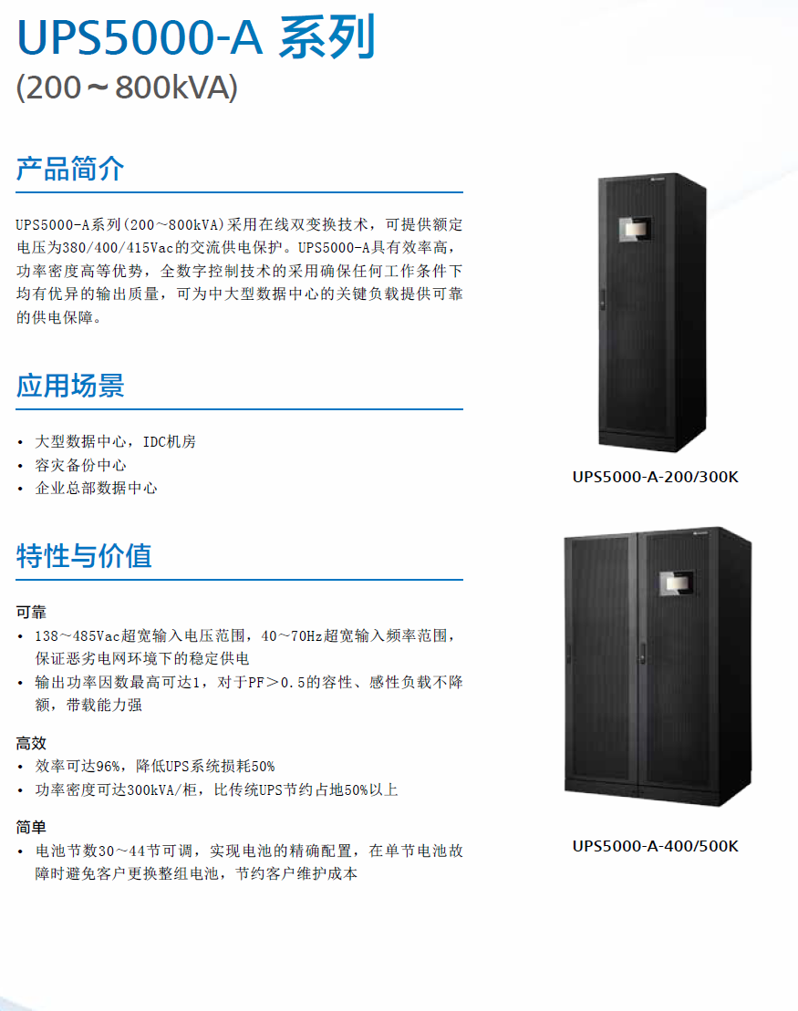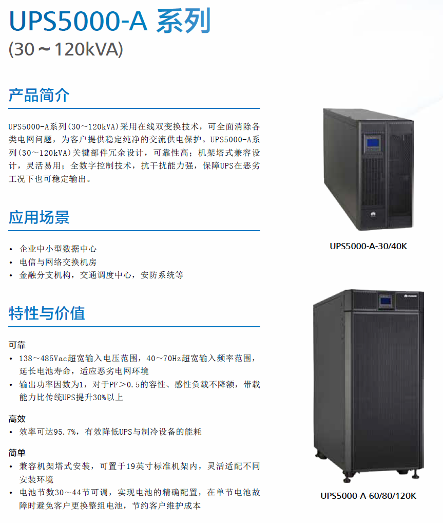 UPS5000-A系列(30-800kVA)采用在線雙變換技術(shù),可為中大型數(shù)據(jù)中心、調(diào)度中心、控制中心、管理中心等關(guān)鍵場(chǎng)景的重要負(fù)載提供額定電壓為380/400/415Vac的交流供電保護(hù)。 UPS5000-A具有可靠性高、效率高、功率密度高等優(yōu)勢(shì),全數(shù)字控制技術(shù)的采用以及1400余項(xiàng)測(cè)試確保任何工作條件下均有優(yōu)異的輸出質(zhì)量,可為中大型供電場(chǎng)景提供可靠的不間斷供電保障。