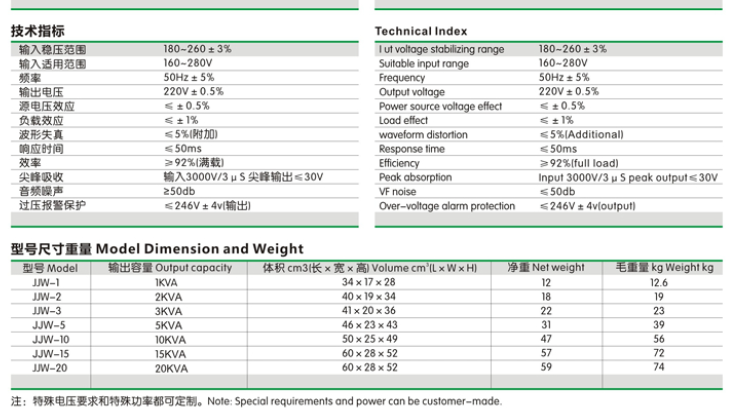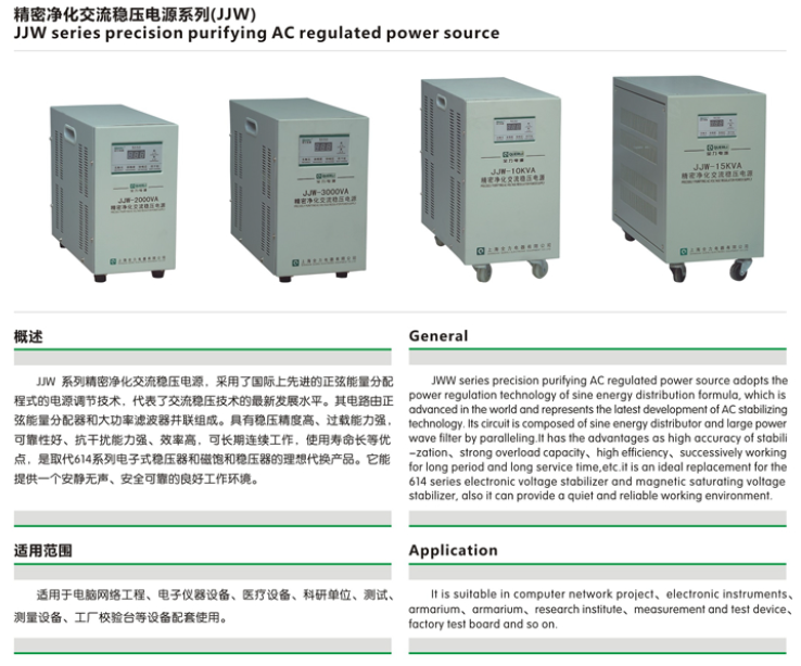 JJW系列精密凈化交流穩(wěn)壓電源,采用了國際上先進的正弦能量分配 程式的電源調(diào)節(jié)技術(shù),代表了交流穩(wěn)壓技術(shù)的最新發(fā)展水平。其電路由正 弦能量分配器和大功率濾波器并聯(lián)組成。具有穩(wěn)壓精度高、過載能力強, 可靠性好、抗干擾能力強、效率高,可長期連續(xù)工作,使用壽命長等優(yōu) 點,是取代614系列電子式穩(wěn)壓器和磁飽和穩(wěn)壓器的理想代換產(chǎn)品。它能 提供一個安靜無聲、安全可靠的良好工作環(huán)境。 適用范圍 適用于電腦網(wǎng)絡(luò)工程、電子儀器設(shè)備、醫(yī)療設(shè)備、科研單位、測試、 測量設(shè)備、工廠校驗臺等設(shè)備配套使用。