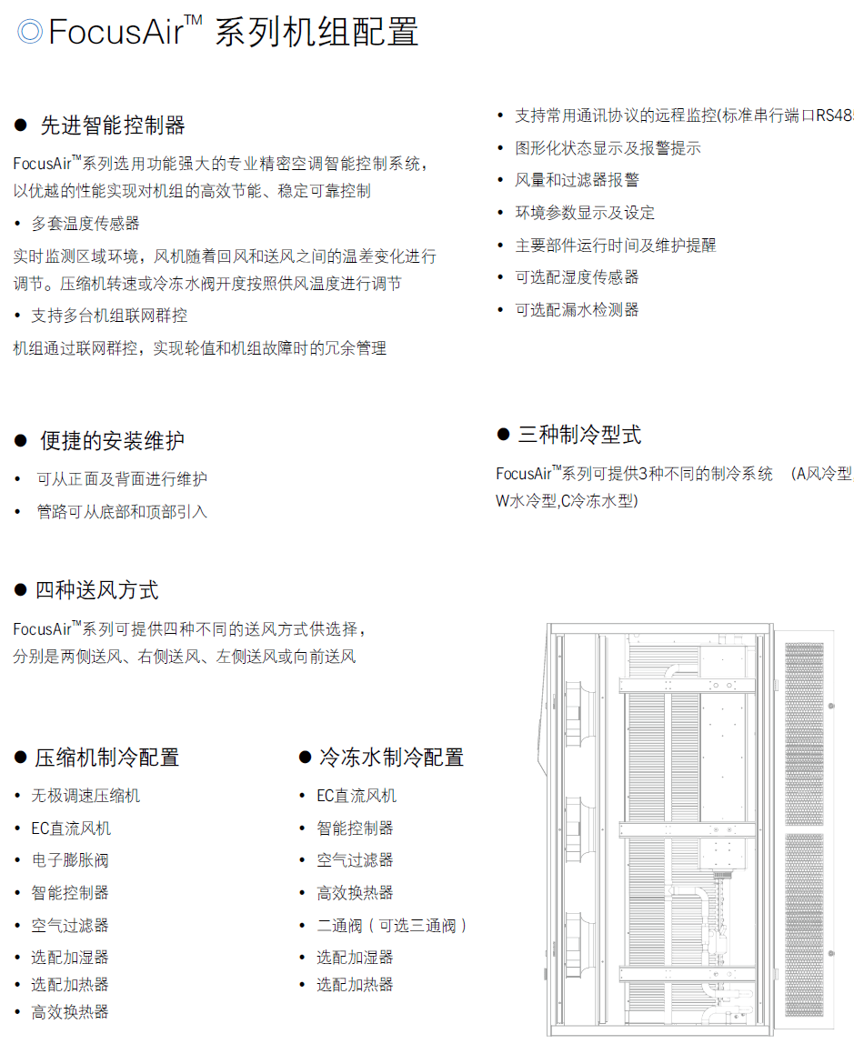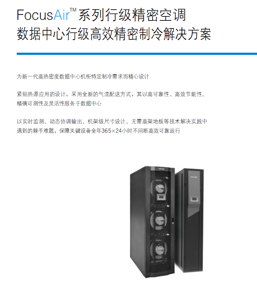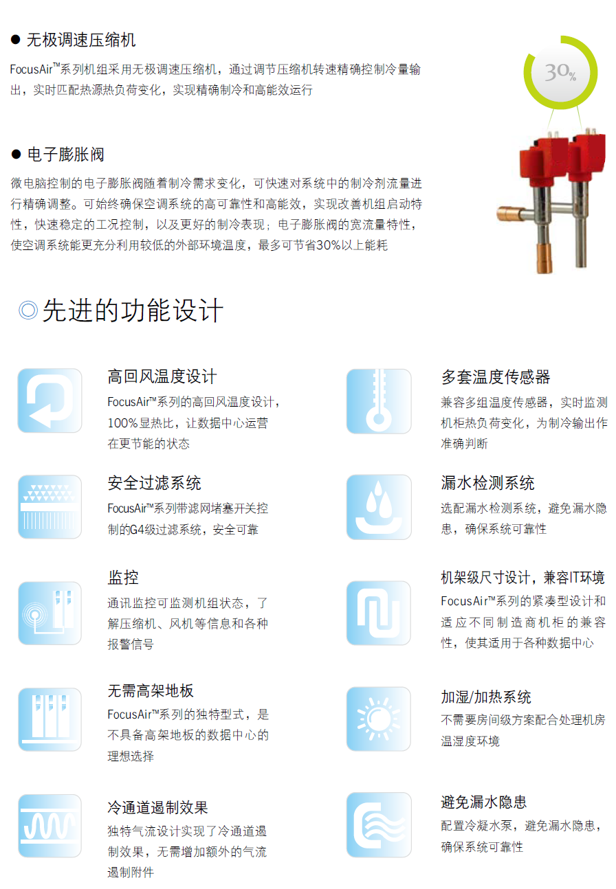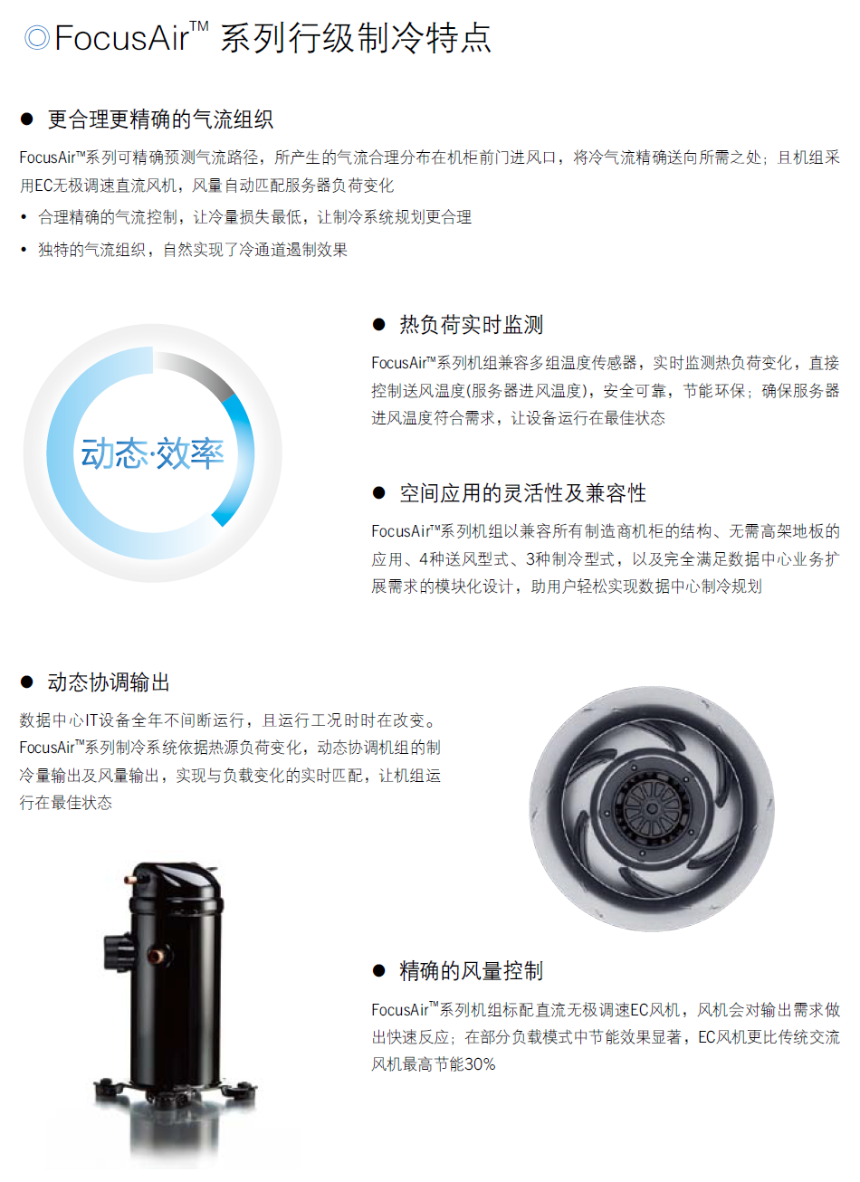 FocusAir系列行級精密空調是為新一代高熱密度數據中心機柜特定制冷需求而推出的解決方案。通過緊貼熱源的設計,直接處理服務器排出的熱風,縮短氣流路徑,防止冷熱風交匯、氣流損失降到最低,消除氣流及制冷的不確定性。通過對熱源負荷變化的實時監測,并精確調節制冷輸出量及風機輸出量,使制冷量和送風量精確且可預測,實現更有針對性的精確制冷,完美解決數據中心高密度散熱問題,保障關鍵設備全年365×24小時不間斷高效可靠運行。