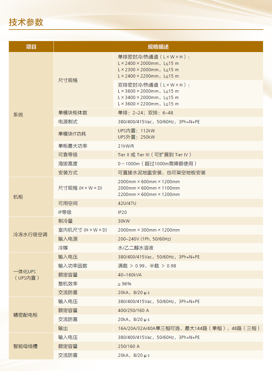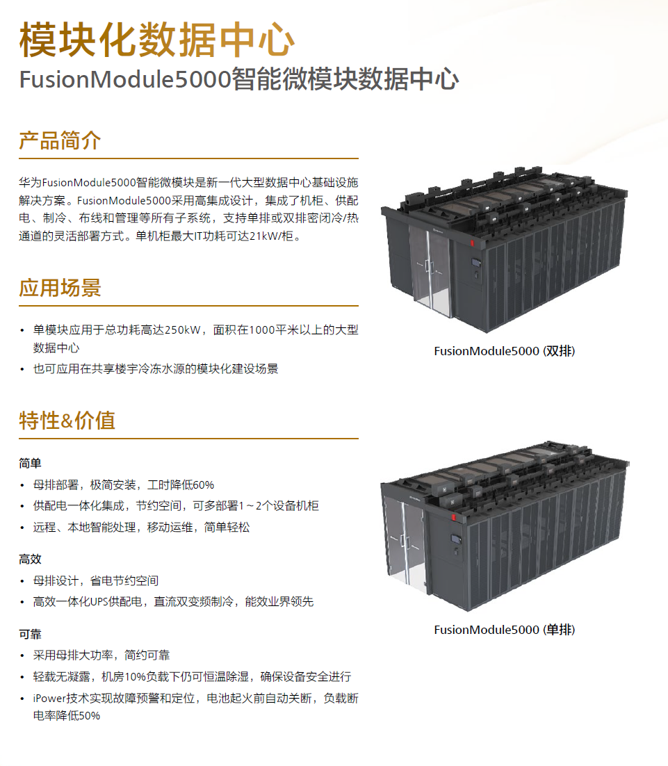 華為FusionModule5000智能微模塊是新一代大型數據中心基礎設施 解決方案。FusionModule5000采用高集成設計,集成了機柜、供配 電、制冷、布線和管理等所有子系統,支持單排或雙排密閉冷/熱 通道的靈活部署方式。單機柜最大IT功耗可達21kW/柜。