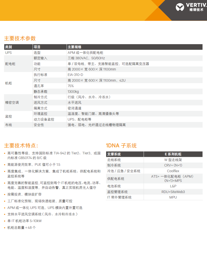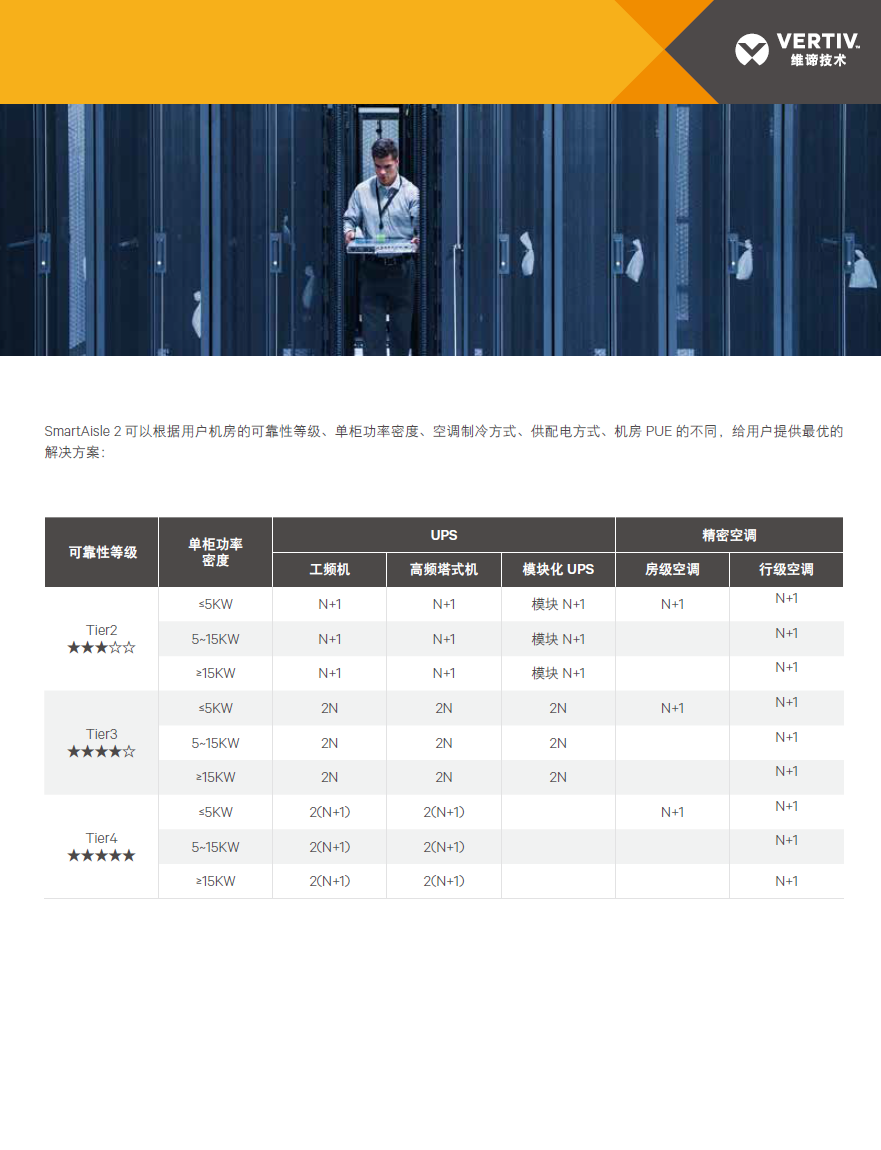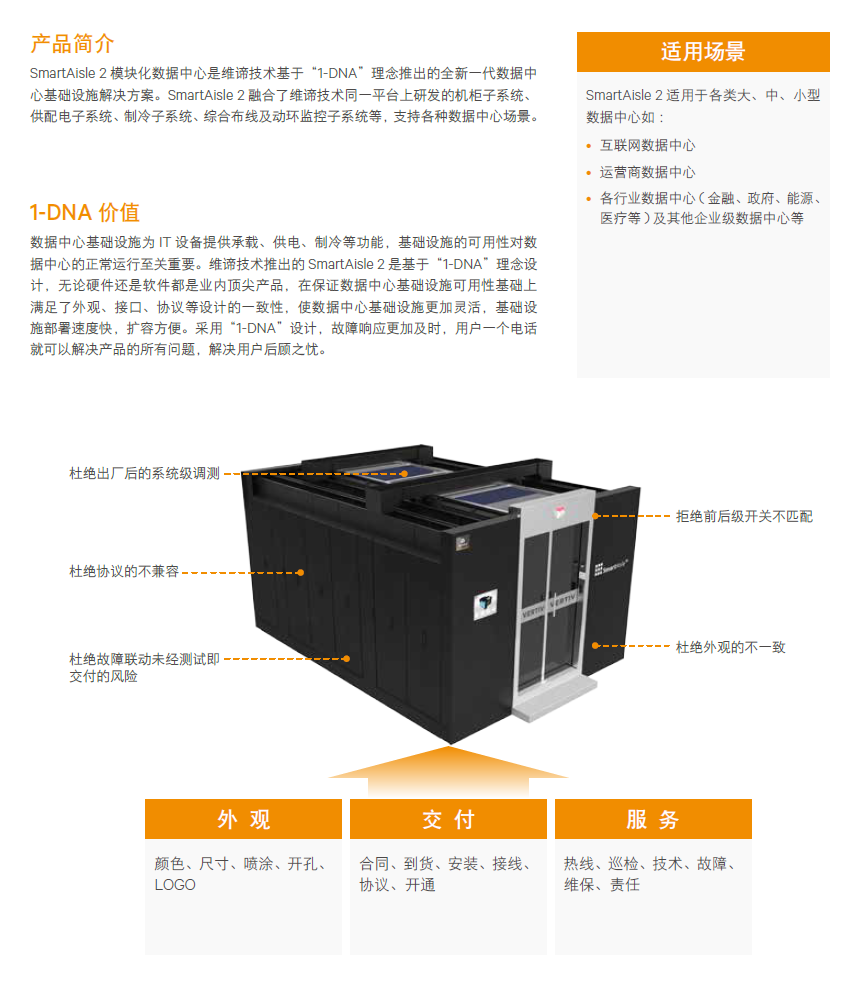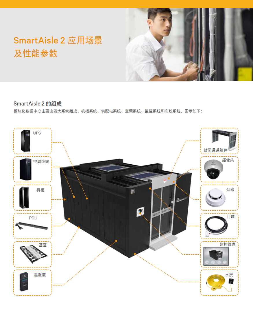SmartAisle 2 模塊化數據中心是維諦技術基于“1-DNA”理念推出的全新一代數據中 心基礎設施解決方案。SmartAisle 2 融合了維諦技術同一平臺上研發的機柜子系統、 供配電子系統、制冷子系統、綜合布線及動環監控子系統等,支持各種數據中心場景。