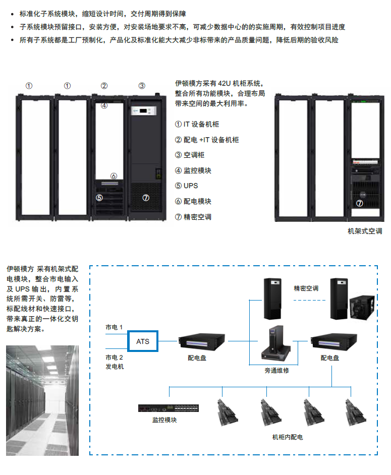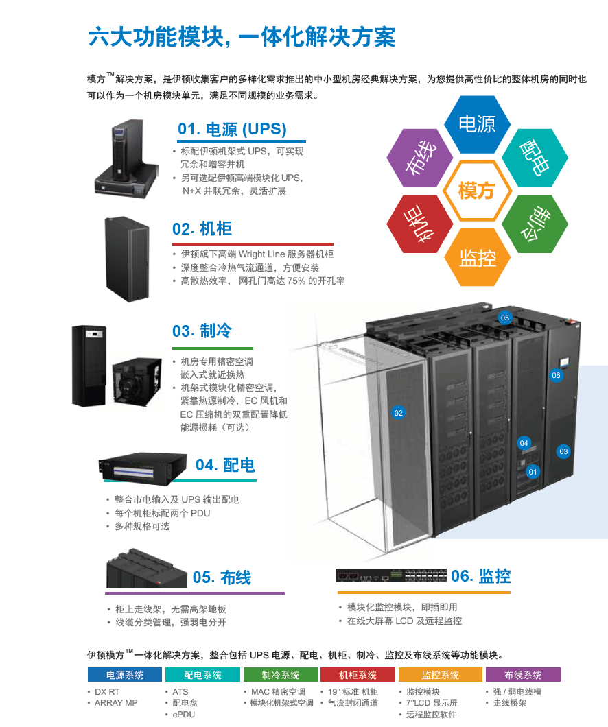 數據中心產業開始向綠色化、標準化、模塊化發展。 能耗偏高及無法迅速適應用戶快速轉變的需求是當今數據中 心面臨的兩大問題。中小型數據中心承載企事業單位、機構或分支機構等的核心業務,構建初期更應該注重節能和 可持續發展。 模方?解決方案,是伊頓收集客戶的多樣化需求推出的中小型機房經典解決方案,為您提供高性價比的整體機房的同時也 可以作為一個機房模塊單元,滿足不同規模的業務需求。 伊頓模方?一體化解決方案,整合包括UPS 電源、配電、機柜、制冷、監控及布線系統等功能模塊。 伊頓模方TM IT空間的智慧之選 應用范圍 解決方案 物理架構是數據中心的基礎,是IT 業務可靠運營的關鍵層。 伊頓 模方TM,無縫整合數據中心物理基礎設施,提供高效綠色的模塊化 一體解決方案,從容應對供電、制冷、擴容、管理等幾個方面帶來 的挑戰。將幫助您構建一個可靠、高效、安全的數據中心。
